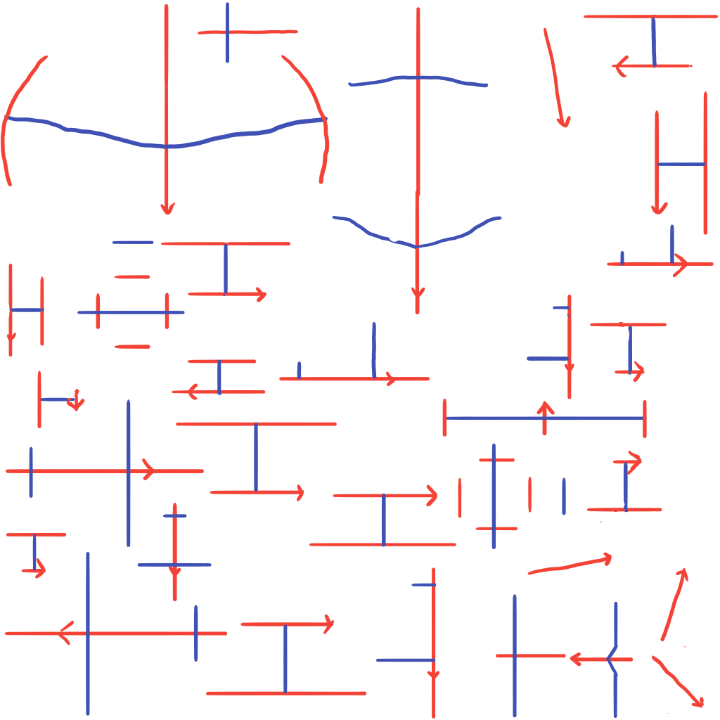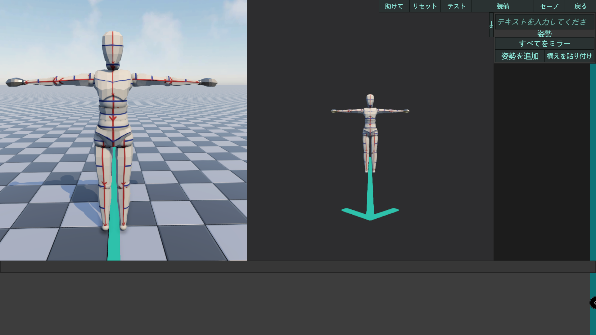 スキン作成時に使える作業用スキンです。赤線が縦方向を表しており、矢印のあるほうが前で矢印の向きは下側を指しています。青線は横方向を表しており、足や腕周りは外側のみ青線があります。