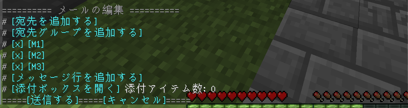 本文は[M1]等と書かれた箇所をクリックすると本文を入力できます。(コマンドが自動で入力されるので、コマンドを変更せずに本文だけ入力してください。改行等は次のメッセージ行へ移ればできます。メッセージ行の削除は[x]をクリックしてください)