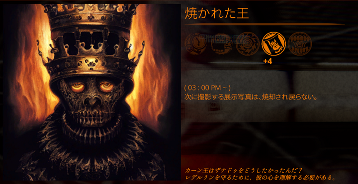 | S01-15 | データ破損領域 | 焼かれた王 | 3 PM ~ | +4 | 次に撮影する展示写真は、焼却され戻らない。 | ||||