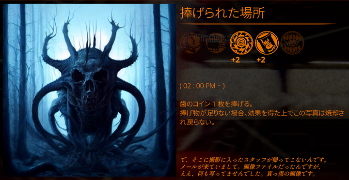 | S02-20 | スケアリイ・オフィス | 記憶にいない母 | 4 PM ~ | +4 | 歯のコイン1枚を捧げる。 捧げ物が足りない場合、効果を得た上でこの写真は焼却され戻らない。 | ||||