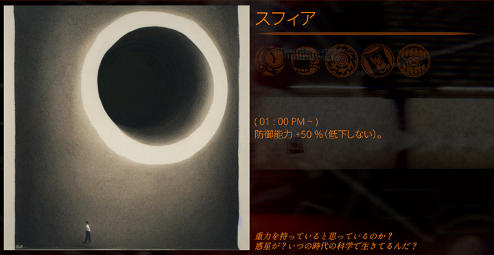 | S02-09 | スケアリイ・オフィス | 守護重力 | 2 PM ~ | +60 | 防御能力+25%(低下しない)。 次に撮影する展示写真は、焼却され戻らない。 |