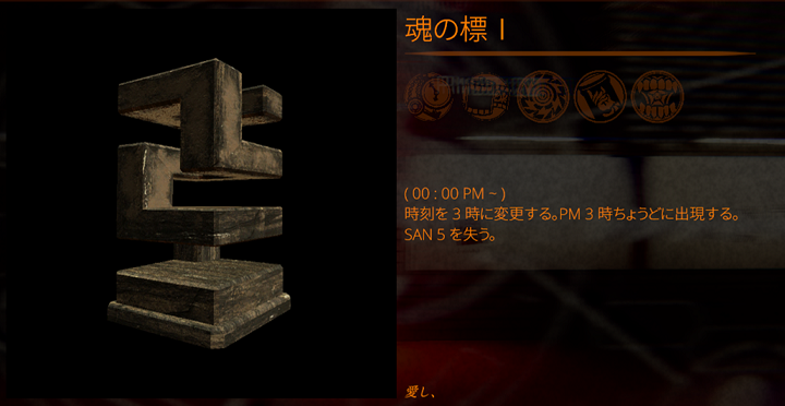 | S00-01 | 特殊 | 魂の標Ⅰ | 0 PM ~ | 時刻を3時に変更する。PM3時ちょうどに出現する。 SAN5を失う。 | |||||