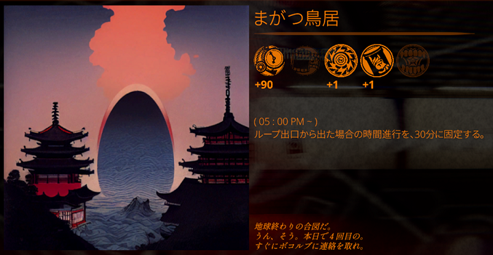 | S03-16 | ひふみの城 | まがつ鳥居 | 5 PM ~ | +90 | +1 | +1 | ループ出口から出た場合の時間進行を、30分に固定する。 | ||