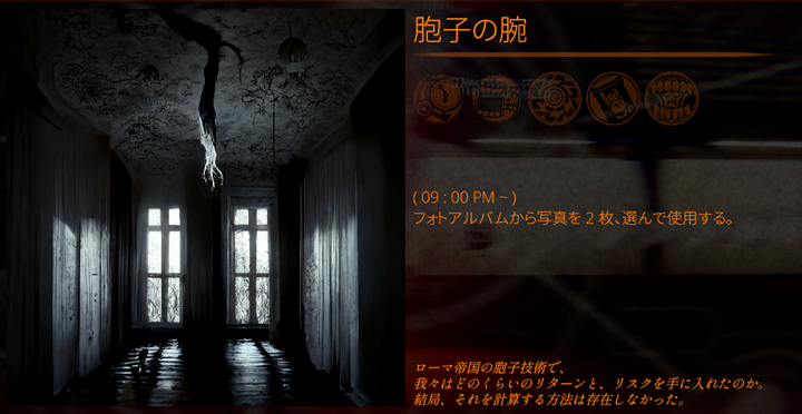 | S04-12 | アトモスフィア・ハウス | 火葬 | 3 PM ~ | 感情などの特性を無視して、犠牲者のスペルを1文字得る。 使用するとギャラリールームの「チェスト」の中身が減少する。 効果を発揮した場合、この写真は焼却され戻らない。 | |||||