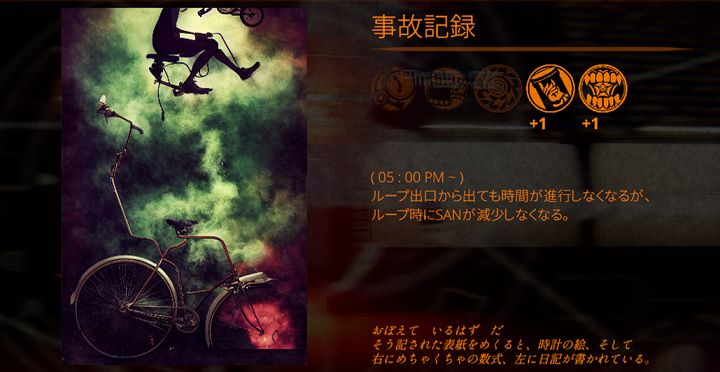 | S05-17 | ドリーム・オブ・エイプス | 事故記録 | 5 PM ~ | +1 | +1 | ループ出口から出ても時間が進行しなくなるが、ループ時にSANが減少しなくなる。 |