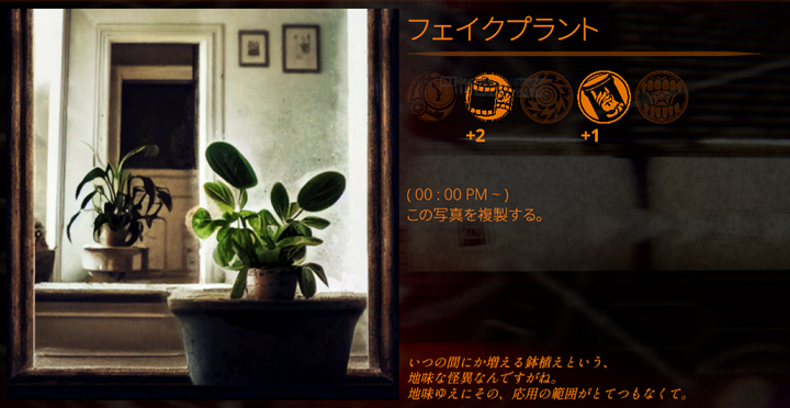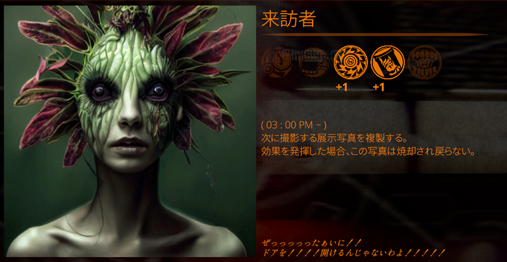 | S01-14 | データ破損領域 | 来訪者 | 3 PM ~ | +1 | +1 | 次に撮影する展示写真を複製する。 効果を発揮した場合、この写真は焼却され戻らない。 |