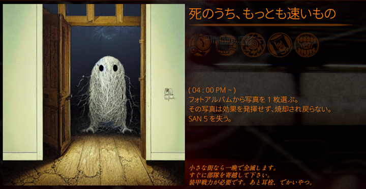 | S04-20 | アトモスフィア・ハウス | 死のうち、もっとも速いもの | 4 PM ~ | フォトアルバムから写真を1枚選ぶ。 その写真は効果を発揮せず、焼却され戻らない。 SAN5を失う。 | |||||