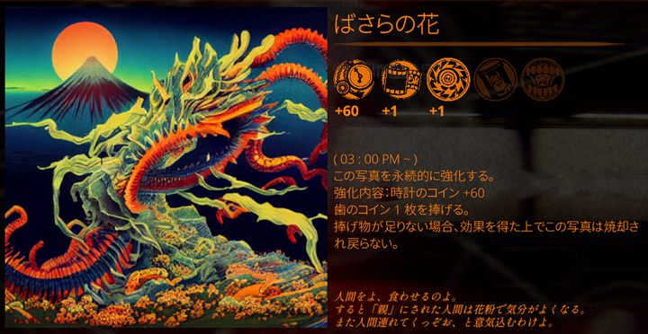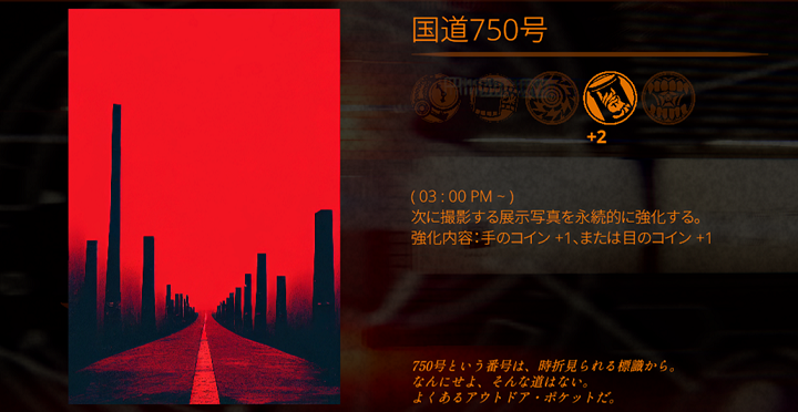 | S05-09 | ドリーム・オブ・エイプス | 国道750号 | 3 PM ~ | +2 | 次に撮影する展示写真を永続的に強化する。 強化内容:手のコイン+1、または目のコイン+1 |