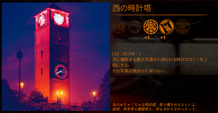 | S02-14 | スケアリイ・オフィス | 西の時計塔 | 3 PM ~ | +1 | +1 | 次に撮影する展示写真から得られる時計のコインを2倍にする。 その写真は焼却され戻らない。 | |||