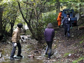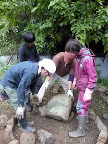 篠原川で少し大きな石を探して、バケツリレーで運ぶ。