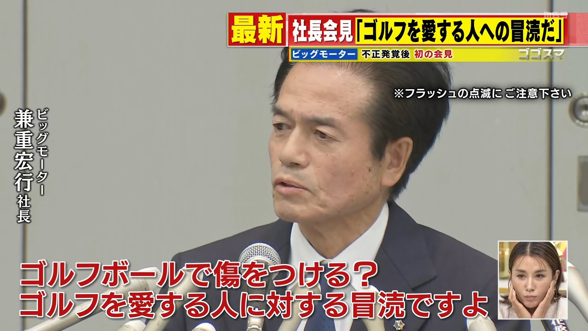 2023年7月25日に開かれたビッグモーターの記者会見では、当時社長を務めていた兼重宏行が大粒の雹が車に当たったよう偽装するため靴下の中にゴルフボールを何個か入れて振り回し、車体に凹みを作るという、衝撃的な行為が報告されたに対しての釈明に、「こんなひどいことをしているなんて信じられない、“ゴルフを愛する人への冒涜ですよ!”」と発言。