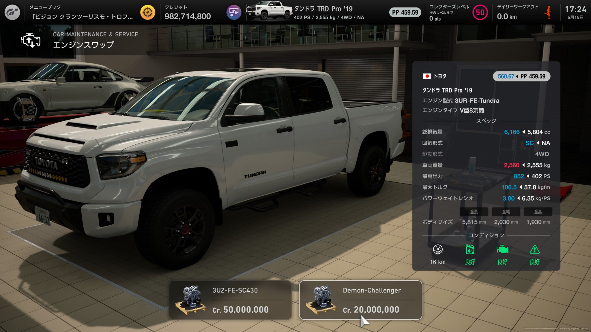 ちなみにアプデで3UZ-FE-SC430、レクサス ペトロナス トムス SC430 '08のエンジンに換装可能になった。レーシングカー用のエンジンで特性が違うので、元のエンジンと比べると排気量や最大トルクでは劣っているが、高回転型ターボチャージャーを搭載してフルチューンすれば元のエンジンを載せた状態でフルチューンするよりパワーアップできる。ボディもデカイ分頑丈なので、他のエンジン載せ替えできる車種と比べるとボディがパワーに負けてしまう事も無いはずだが、軽量化はしておきたい。出来ればステージ5が欲しいが…。