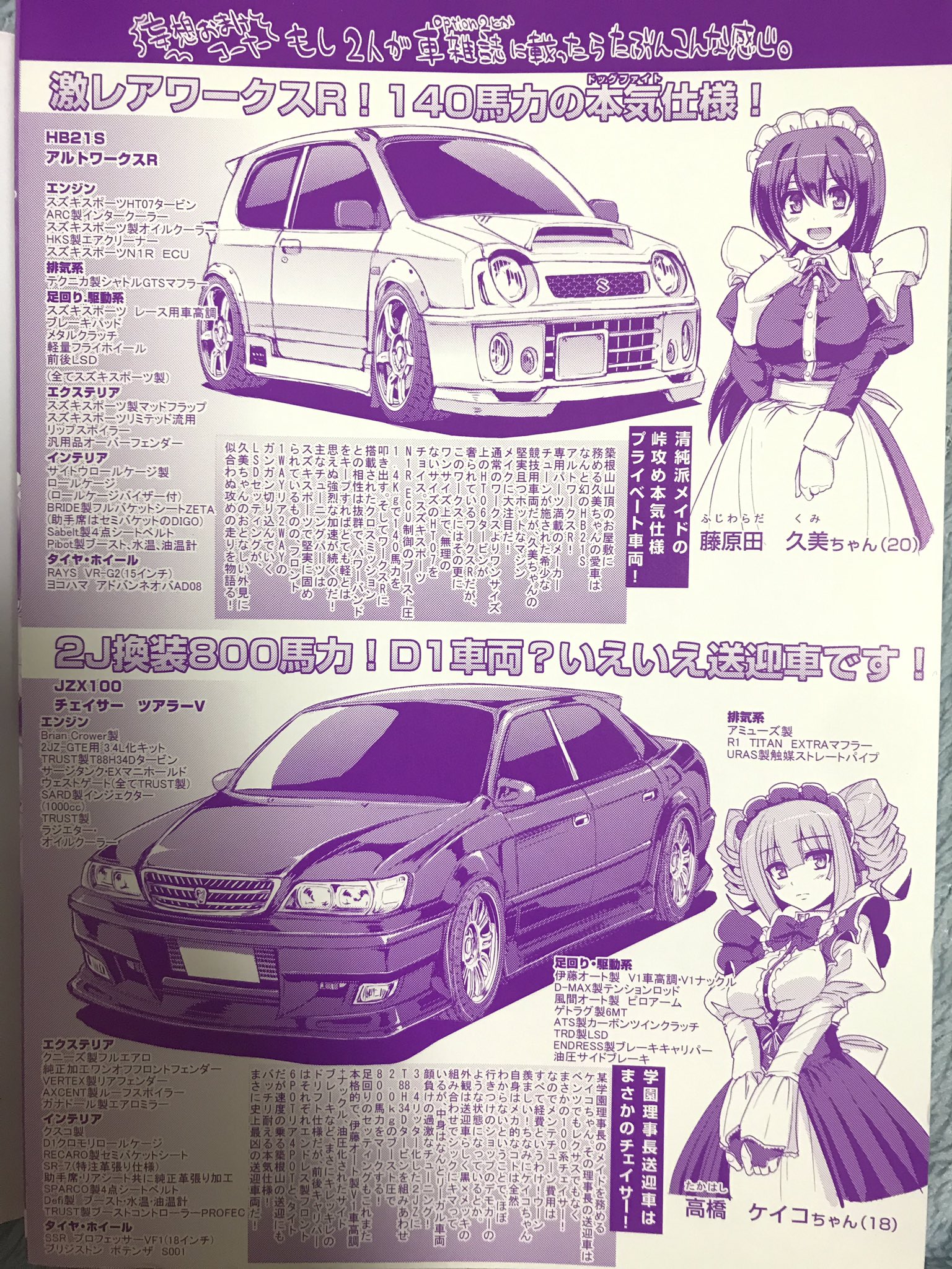 と言っても出てくるのがゴリゴリにチューンされたアルトワークスとチェイサー(しかも2JZ搭載)というかなりクルマ漫画として見ても濃すぎる内容でここに掲載されている全年齢向けのクルマ漫画と張り合えるほど。メイドの萌えキャラやエロ要素はあくまでオマケで、正直完全にお菓子はあくまでオマケとなってしまった食玩のようなエロ漫画。
