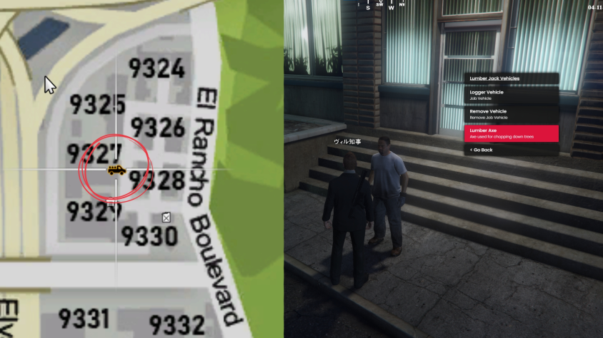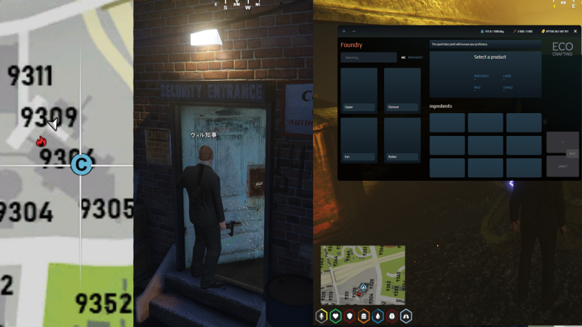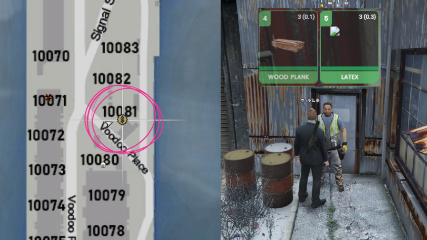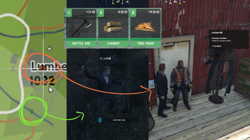 斧を装備して、1082あたりの緑色のTの場所で木を切ると、「Lumber」「Tree Bark」が取れます。1082のオレンジ色のリサイクルマークで「Lumber」を加工できます。確率で「Wood Plank」と「Latex」が手に入ります。