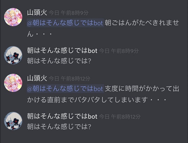ギルドのdiscordで,「朝はそんな感じではbot」にメンションをつけて朝のお悩みを言うと,botが「朝はそんな感じでは?」と返してくれる.botには中身がいるとかいないとか.