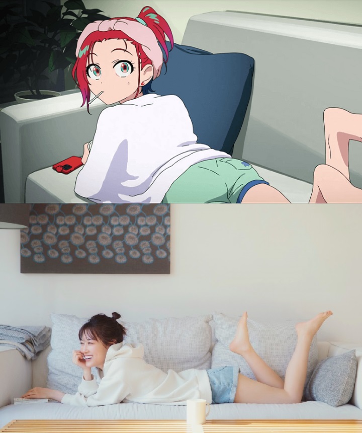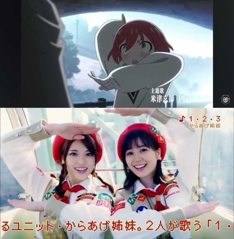 最初と最後のメインキャラクターが左に向かって走るシーンの機体と背景の色が、元乃木坂46の西野七瀬のサイリウムカラーである緑と白になっている。