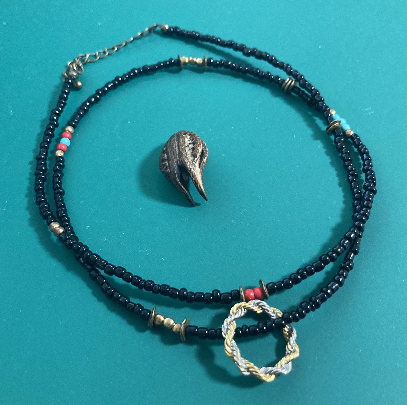 生まれた時に持たされた3種のお守りの2種であり、各衣装に造形が反映されている。