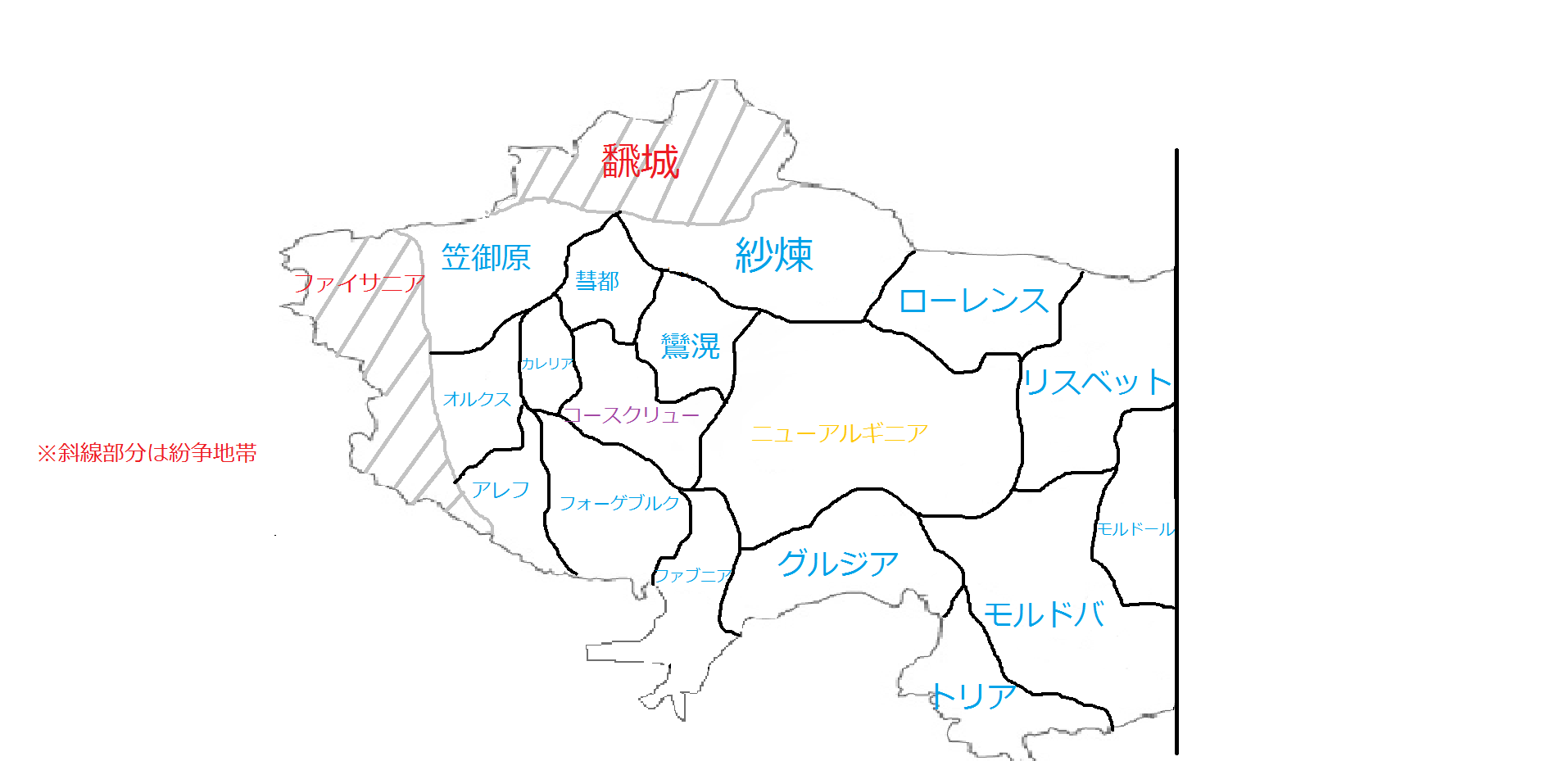 陸軍・・・紗煉陸軍基地・香悠陸軍特殊部隊基地・鸞滉陸軍基地・ニューアルギニア陸軍大本営・笠御原基地など
