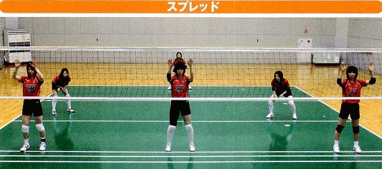 スプレッドブロックは、中央に1枚、ネットの左右アンテナ付近に1枚づつブロックを配備した布陣です。中央の攻撃には弱くなってしまいますが、相手がBクイックやDクイックを多く使ってくる場合に有効な布陣と言えるでしょう。