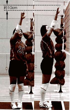 一方、左手を引きつけるようにして、空中で左右の軸を入れ替えながらスパイクすると、インパクトで体が前を向きます。このときの腕の高さを比べると、身長にもよりますが、10cm前後は高い打点で打てるようになります(写真右)。さらにポールに体重も乗り、強いスパイクが打てるようになります。