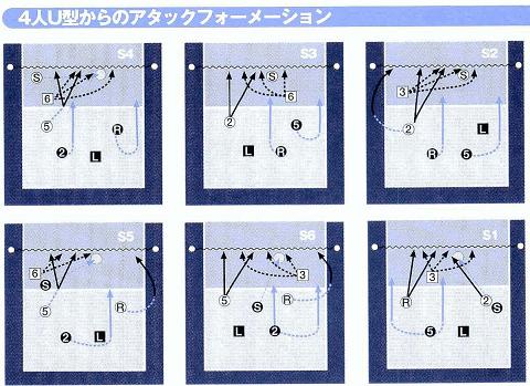 夫できます。なおこのフォーメーションにおけるパイプ攻撃と両サイドの速攻(スプレッド攻撃)が世界のバレーをリードしており、最近ではバックアタックの高速化がますます進んでいます