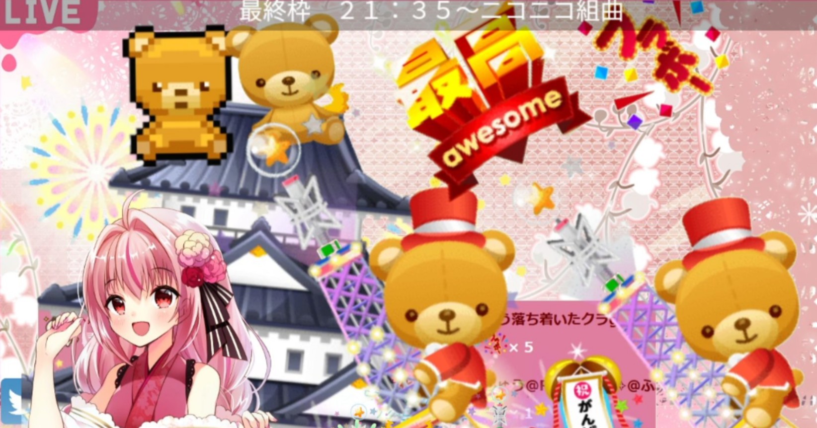 - 3/7 決勝最終日、最終枠でニコニコ組曲を披露。終了5分ちょっとまえから、さらにギフトがたくさん飛び交う。最終的に城とタワーでいっぱいになり、なな帝国が出来上がる。