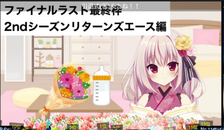 - 歌枠、お絵かきクイズ枠を実施。ハードなタイテの中、最終枠終了時に暫定1位になる。