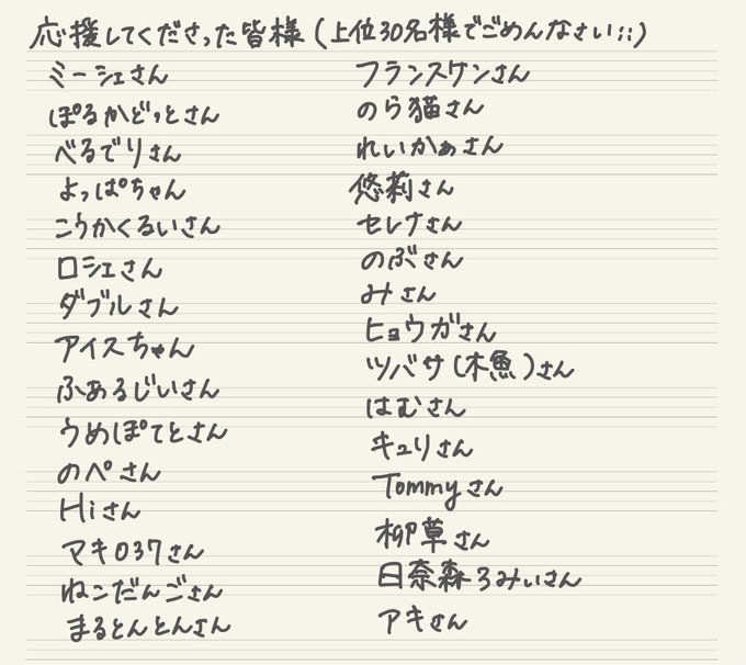 桜華鞠を応援してくれた方々(累計ポイント上位30名)