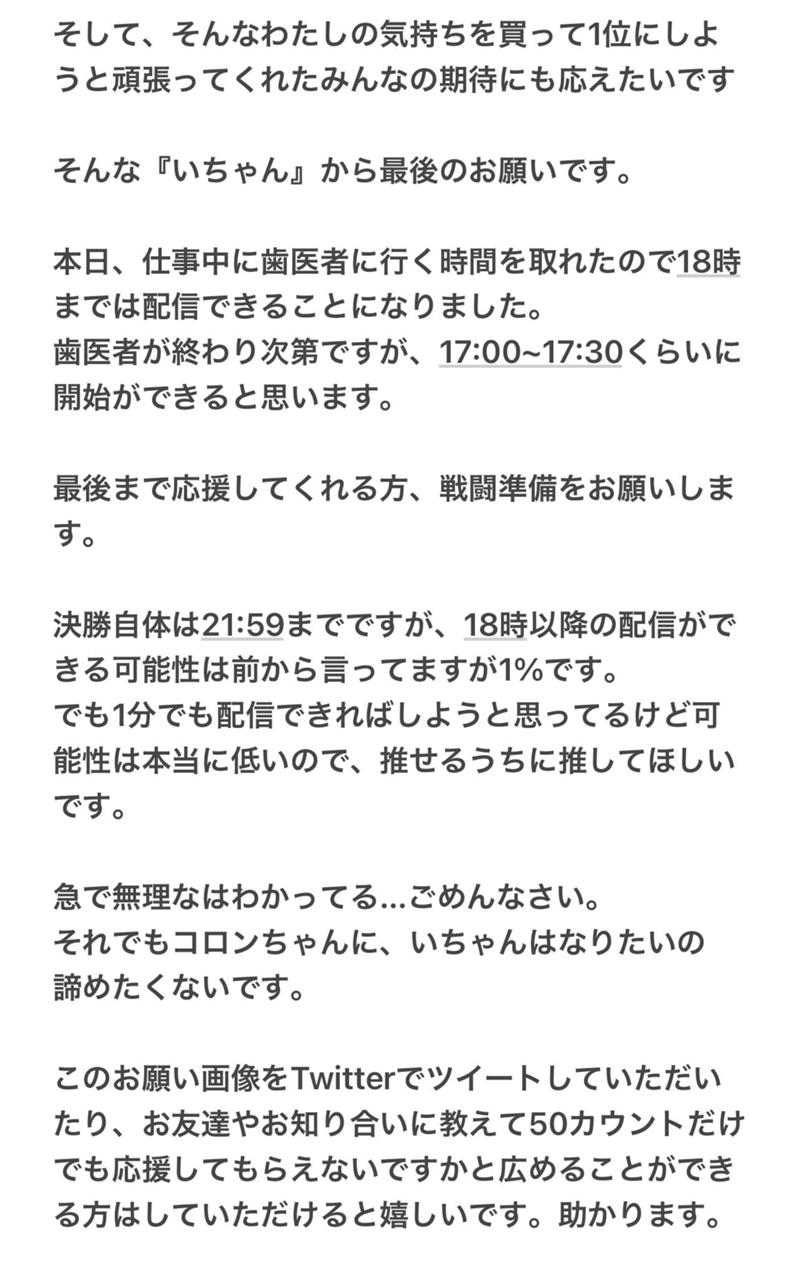 決勝最終日と最終日前日の夕方以降に配信できるかかなり怪しい状況であることを吐露。最悪の場合最終日前日の朝配信が決勝ラストになるかもしれないとのこと。