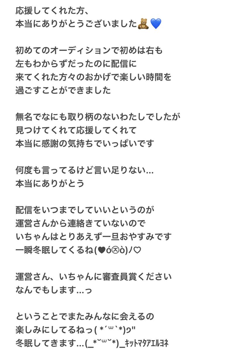 今日は配信短くて申し訳ないスタート1位にしてくれたのに2位に落ちて悔しいとのこと。