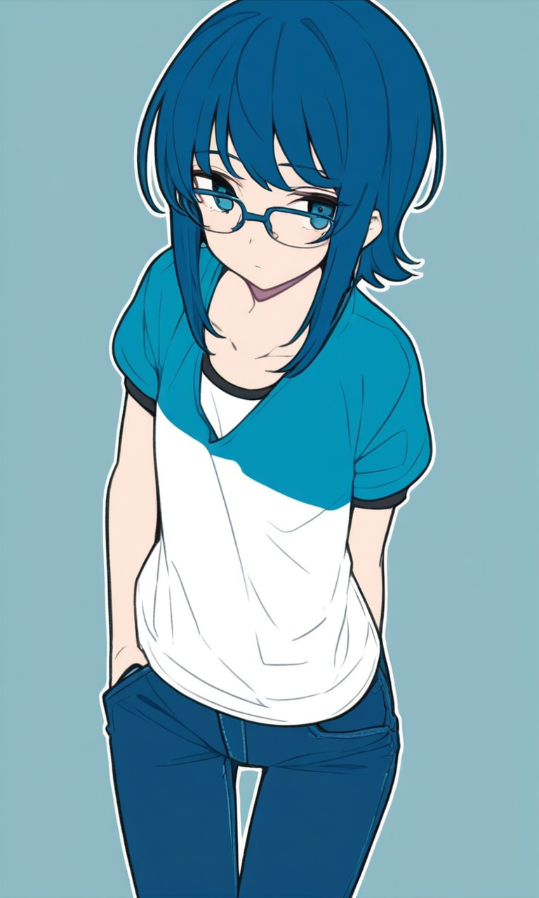 青い髪に眼鏡、シンプルめなシャツにジーンズパンツ(日常)