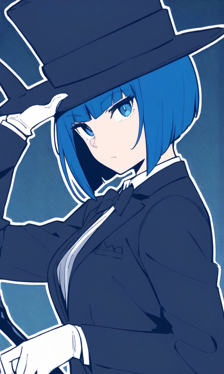 青い髪にシルクハット、タキシードにマジシャンズステッキ(ヒーロー)