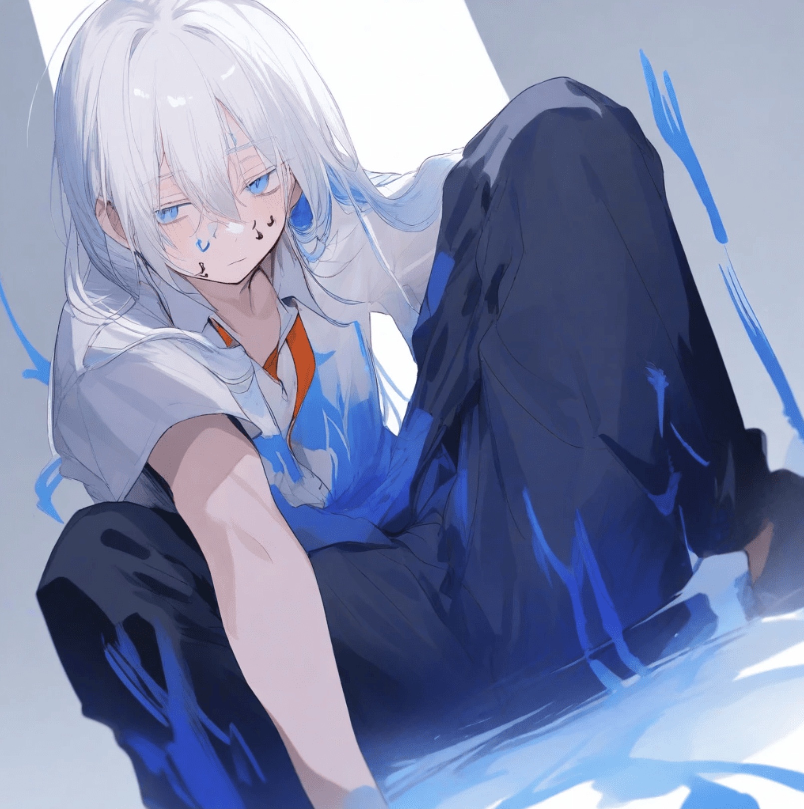 白髪と水色のグラデーションヘア(ロング)で、水色の瞳をしている。服はもっぱら作業着である。
