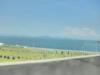 岡山に向かう間に瀬戸大橋を渡りました。往路の時は夜だったので景色を見ることはできませんでしたが、この復路では広大な海の景色を堪能することができました。