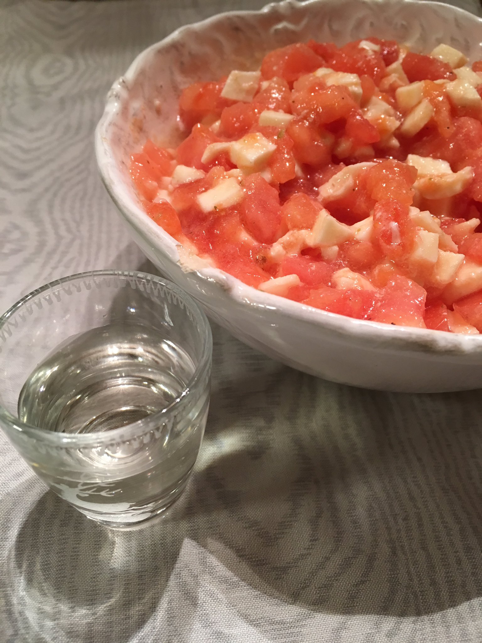 - チーズとトマトのおつまみは細かくしています。熟し過ぎトマトの時の残念写真でごめんなさい…