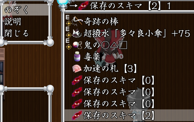 - 入れた装備を取り出すことが出来る…容量が3以上なら保存のスキマで確定、容量が2なら保存のスキマか調合のスキマのどちらか