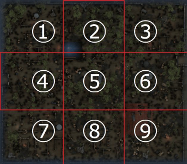 軍需工場でサバイバーが②⑤⑧⑨に取り、ハンターは⑦(カラス奥)を選択したと仮定する(下図参照)。