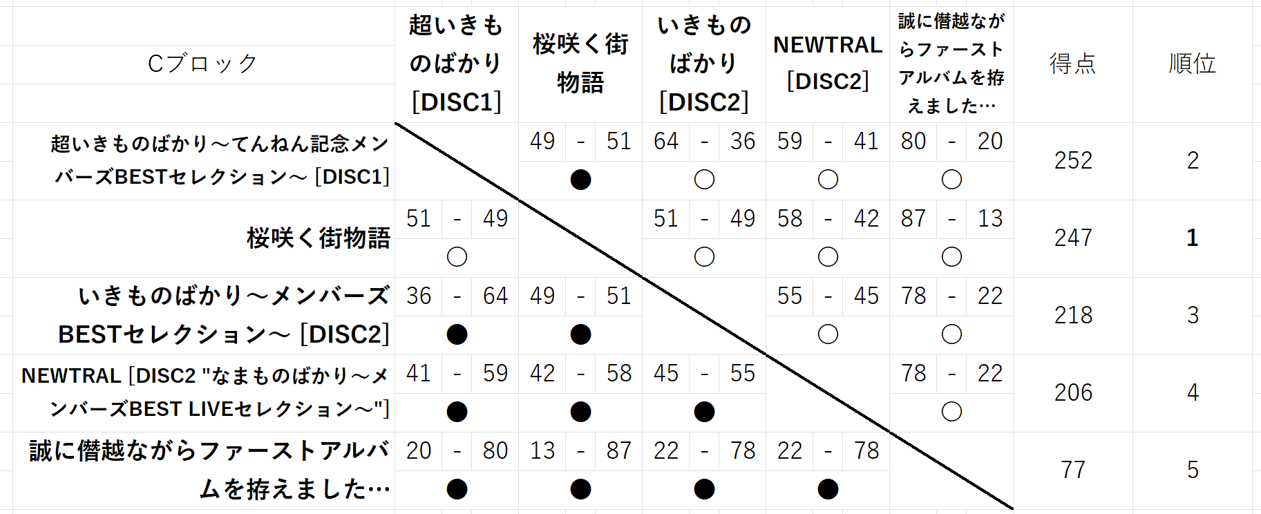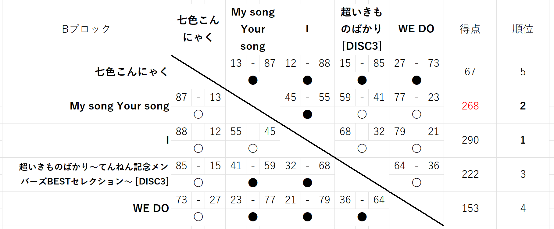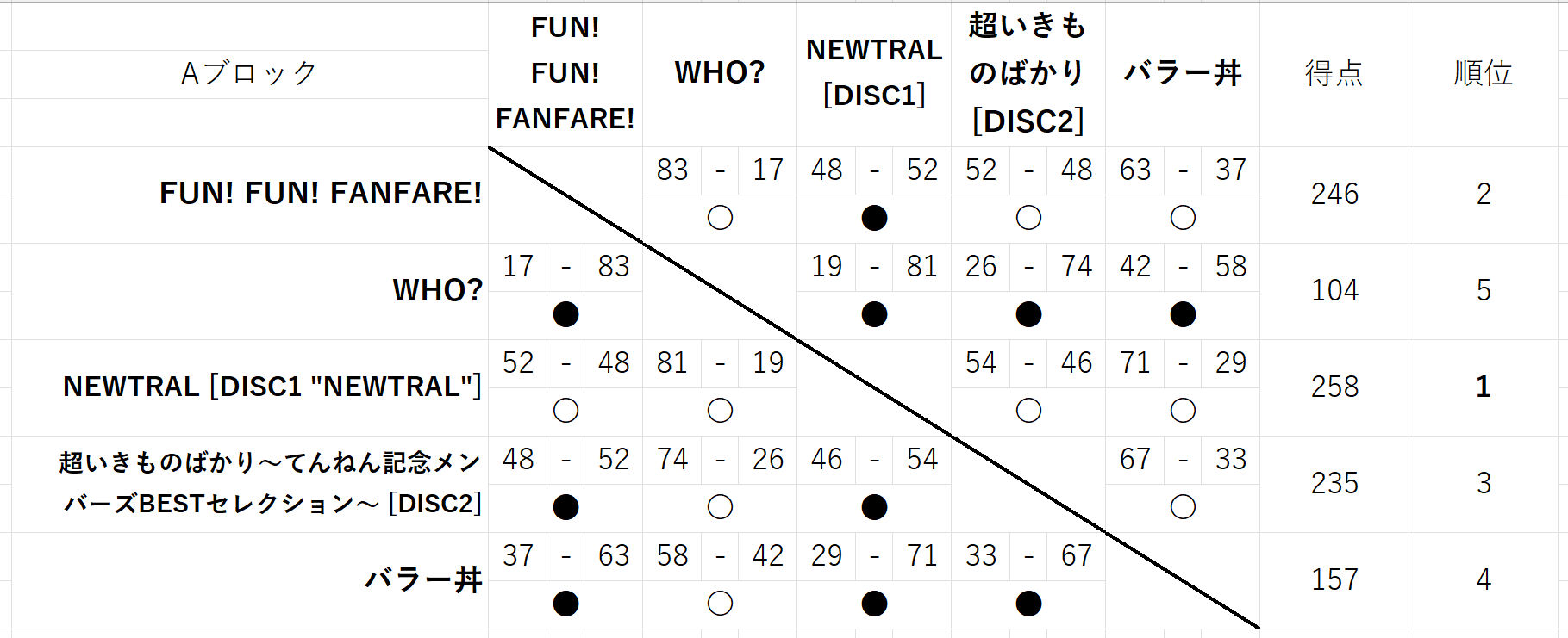 各ブロックの1位通過+全ブロックの2位のうち、一番得点の高かったアルバム、計5つで総当たりを行いました。