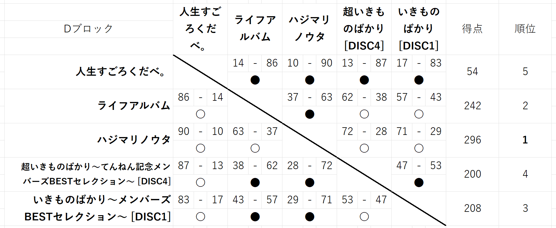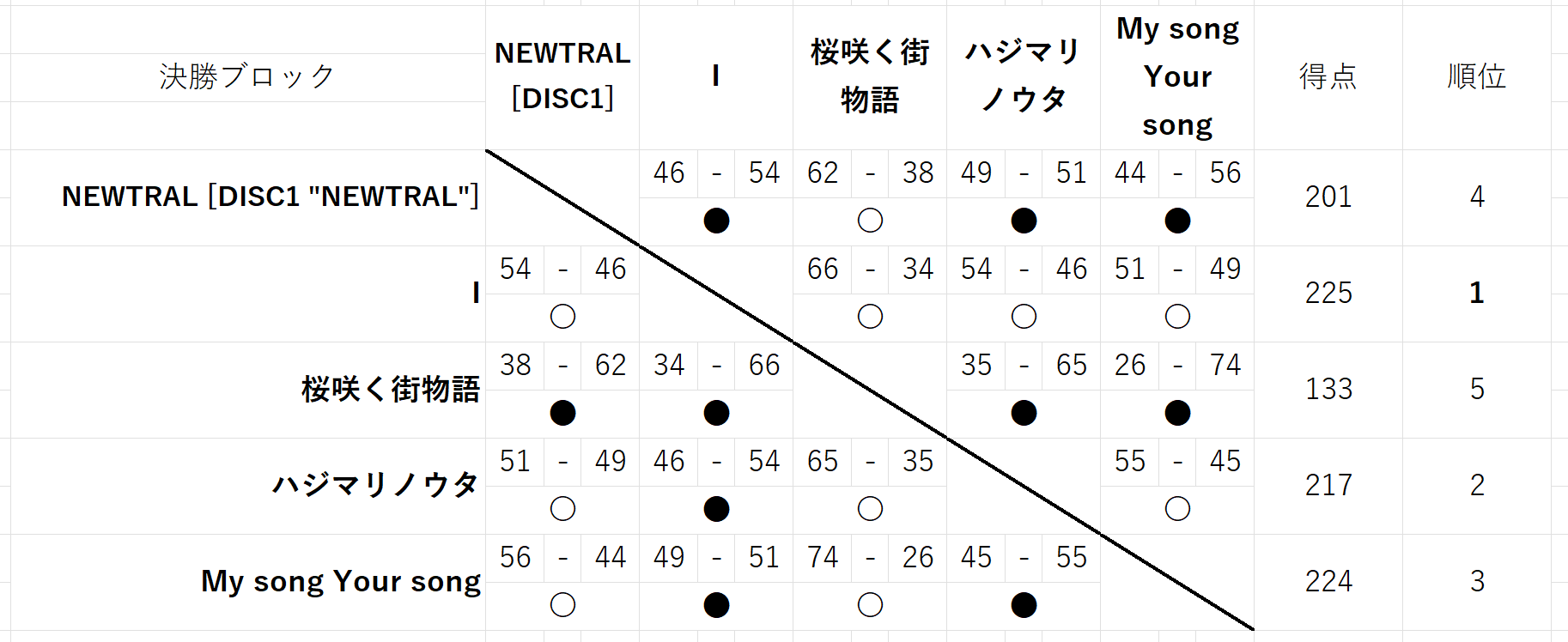 得点でいえば、My song Your songの方が、ハジマリノウタよりも高いが、直接対決によりハジマリノウタの方が順位は上である。