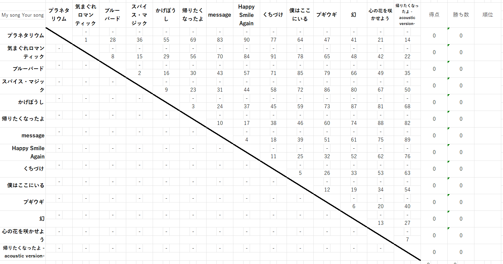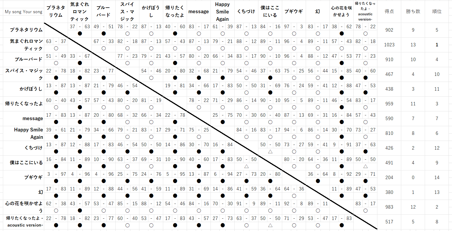 今回は、アルバム内最強曲決定戦の中でも、「My song Your song」を取り上げて、リーグ戦総当たりで試合を行いました。14曲ありますので、計91試合行いました。