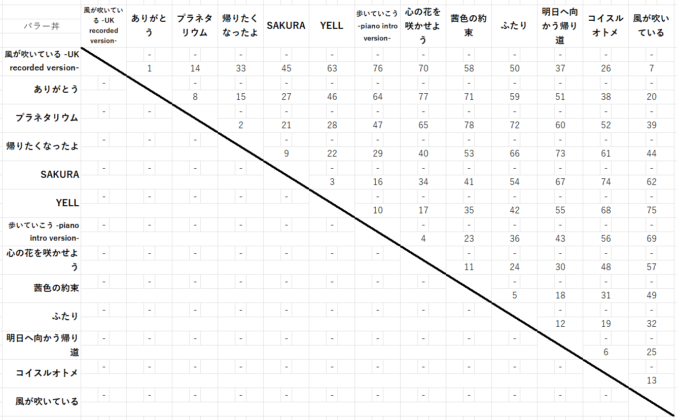 今回は、アルバム内最強曲決定戦の中でも、「バラー丼」を取り上げて、リーグ戦総当たりで試合を行いました。13曲ありますので、計78試合行いました。