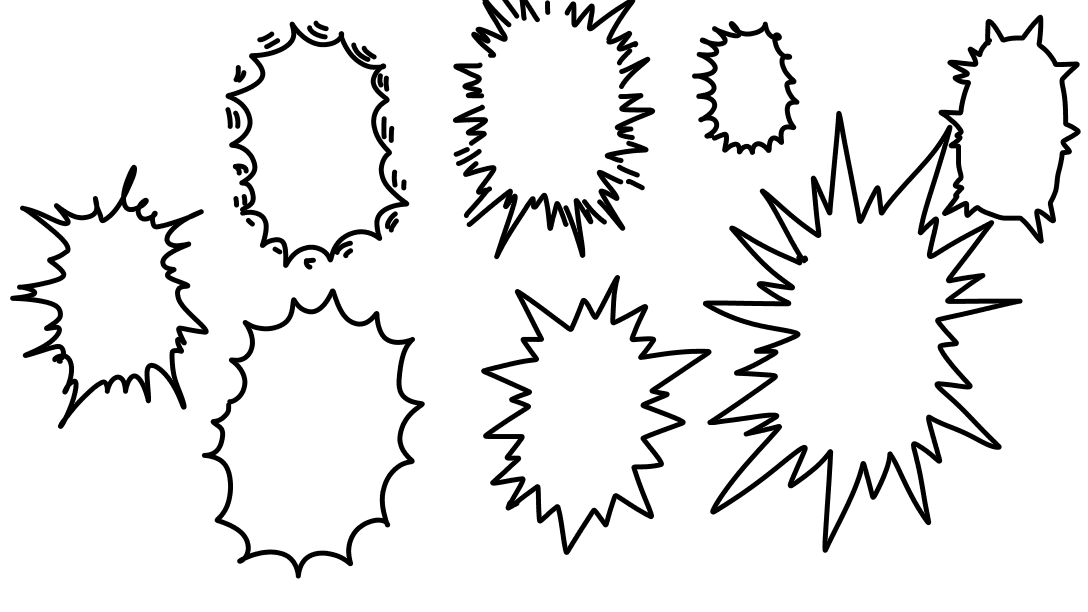 軽く描いてみただけでも これだけ種類がある。それぞれ同じハリフキダシだが、伝わってくる印象は大きく変わる。