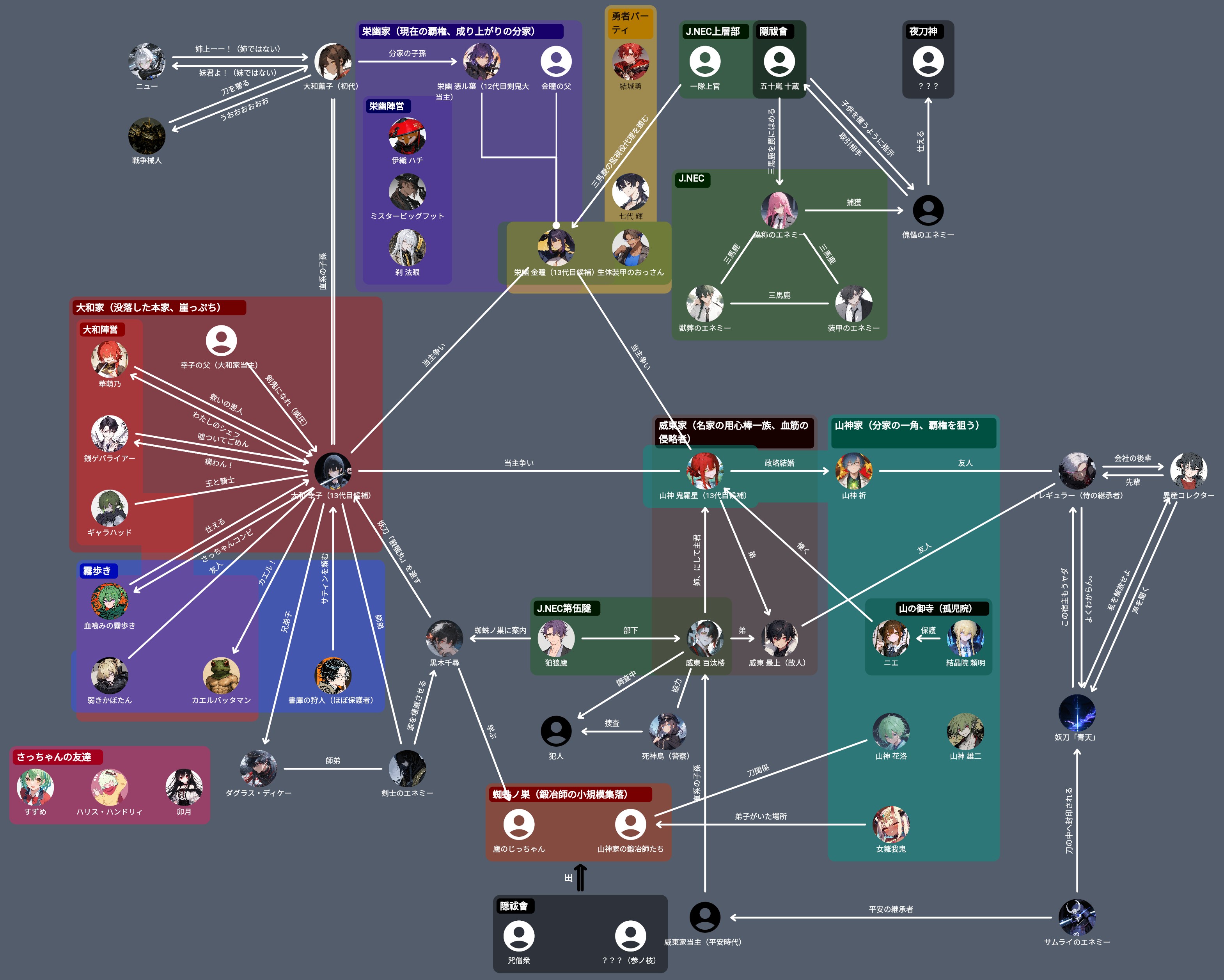 - 基本的にはさっちゃん陣衛を主人公、金瞳陣営をラスボス、鬼&百陣営をライバルのポジションとし、最終的にはさっちゃんが勝つシナリオです。