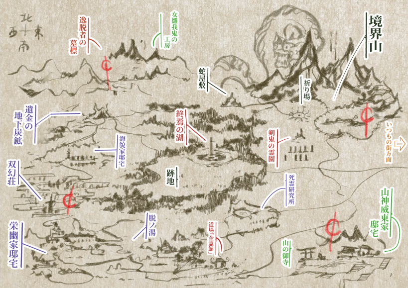 シナリオイベント「剣鬼編」における複数の重要な施設の一覧。