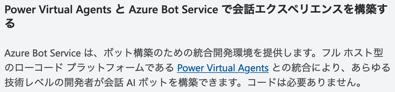 AzureBotServiceはウェブベースの統合開発環境であり、PowerVirtualAgentsはローコードプラットフォームだそうだ。