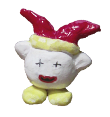 ピエロのような外見の、赤と黄色の二股に分かれた帽子を被ったキャラクター。唇は赤くメイクされている。