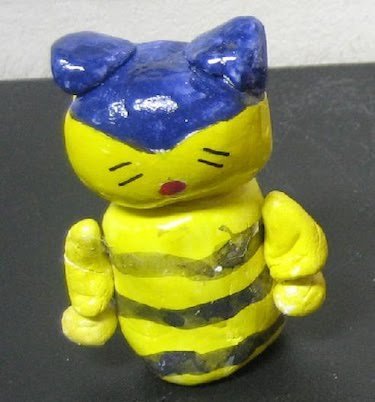 見た目は黄色と黒の縞々模様をした肌のネコ?のような人形。