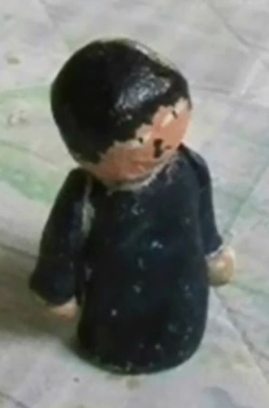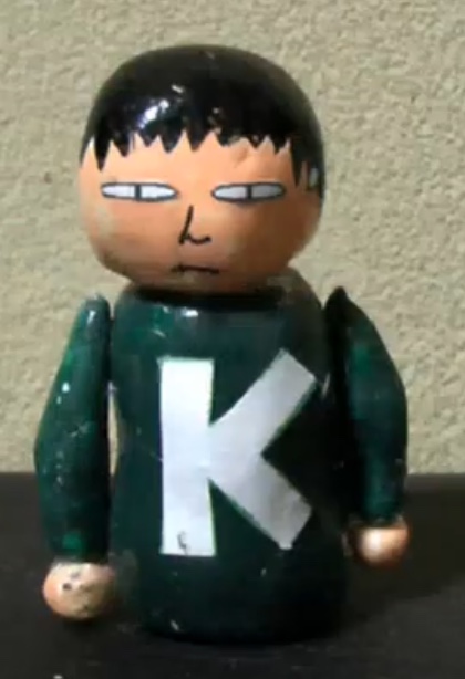 のっぺりとした目とひらがなの「ん」の形の鼻が特徴の、短髪に黒い服を着た人形。