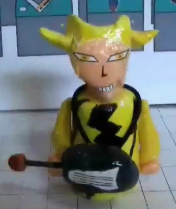 外見は稲妻のマークがあしらわれた服と4つに逆立った金髪が特徴のギターリストの風貌をした人形。