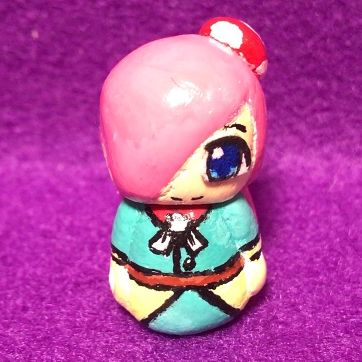 ピンク色の長髪に片目隠れ、頭に小さなキノコの帽子をつけている。